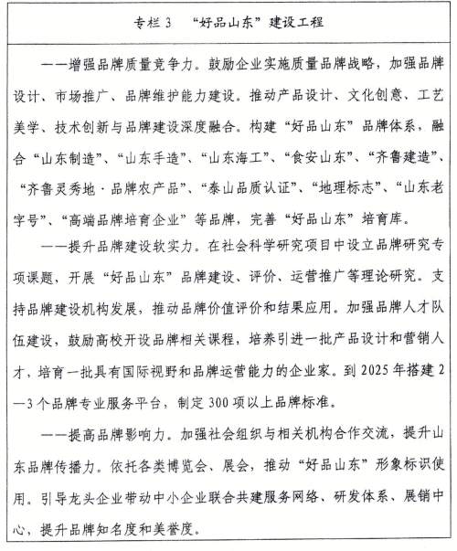(十一)加速品牌系统扶植。成立市场从导、鞭策的品牌成长机制,激发市场从体建立品牌的内活泼力,营制共建共享的品牌生态。加速建立以“好客山东 好品山东”品牌为从体、各类品牌为根本的山东品牌系统。实施品牌建基工程,阐扬企业、行业协会感化,孵化品牌群体。实施品牌培育工程,对各行业部分根据法令律例、政策和品牌扶植响应手艺尺度发生的品牌,纳入“好品山东”培育库融合成长。分类指点、梯次培育,一体推进手艺、尺度、质量、品牌办理立异,打制自从立异、质量高端、诺言过硬、市场的“好品山东”好品库。实施高端品牌引领工程,锻制一批劣势较着的品牌精品。积极争创中国质量,持续开展省长质量评选勾当。